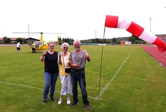 Daumen hoch vor dem Abflug: Katharina, Wilhelmine und Hans-Peter Hoffmann starten zum Hubschrauberflug