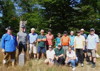Die Teilnehmer der historischen Grenzsteinwanderung mit Jörg Schmidt (l.) an einem Grenzstein mit der Gravur „HN“ für Hessen-Nassau und „GCB“ für Gemeinde Cleeberg. Darunter befindet sich die Nummer des Grenzsteins.