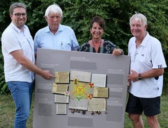 Sie stellen die Planungen für „Cleeheim 774“ vor und zeigen auf der Collage mit den Ersterwähnungen der Langgönser Ortschaften auf die älteste von 744 (v. l.): Marius Reusch, Martin Hanika, Doris Müller-Heinz und Jogi Röhrig.