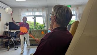 Sitzgymnastik mit Fliegenklatsche und Luftballon.