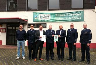 Langgöns / Oberkleen (ikr). Hoher Besuch bei der Freiwilligen Feuerwehr in Oberkleen kurz vor dem Festwochenende anlässlich des 90-jährigen Bestehens der Wehr am 13. und 14. Juli: Der Hessische Innen- und Heimatschutzminister Roman Poseck besuchte die Brandschützer und hatte einen Zuwendungsbescheid in Höhe von 133.375 Euro zur Sanierung und Erweiterung des Feuerwehrgerätehauses im Gepäck.