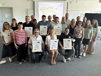 Bürgermeisterin, Bürgermeister, Jugendbeauftragte und Engagierte der Jugendpflegen aus Allendorf (Lumda), Biebertal, Fernwald, Grünberg, Heuchelheim und Hungen haben von Kreis-Jugenddezernent Frank Ide die Urkunden zur Teilnahme am Projekt „Jugendgerechte Städte und Gemeinden – jugendgerechter Landkreis Gießen“ entgegengenommen
