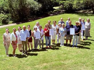 Bei strahlendem Sonnenschein fand die Verleihung des Förderpreises „Kulturregion Landkreis Gießen“ im Gail’schen Park in Rodheim statt: Ein herzliches Willkommen gab es von Landrätin Anita Schneider (rechts), Bürgermeisterin Patricia Ortmann (2. v. l.) und Vereinsvorstand Markus Langhans (4. v. l.).