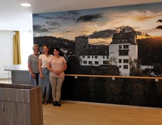 Sie freuen sich auf die baldige Eröffnung der Tagespflege (v. l.): Anja Asmussen, Marina Kammerzell, Pflegefachkraft und stellvertretende Pflegedienstleitung sowie Pflegedienstleitung Alena Shevtsova vor der Fototapete mit dem Cleeberger Schloss.