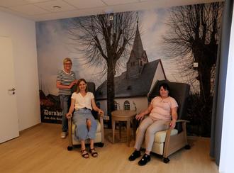 Anja Asmussen, Marina Kammerzell, Pflegefachkraft und stellvertretende Pflegedienstleitung sowie Pflegedienstleitung Alena Shevtsova (v. l.) in einem der Ruheräume vor der Fototapete mit der Kirche in Dornholzhausen