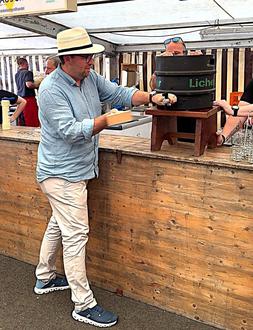 Bürgermeister Marius Reusch trifft zielsicher beim Fassanstich