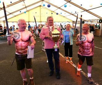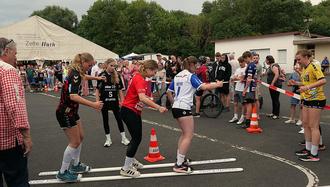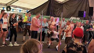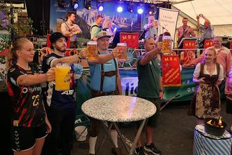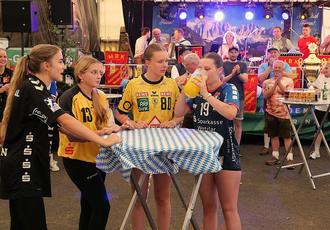 Am Abend feierte die Kirmes dann eine Premiere: Der 1. Skiclub „Scharfe Kante“ organisierte anlässlich seines 40-jährigen Bestehens die erste Alpenolympiade – ein mitreißender Gaudi-Wettbewerb, der perfekt zum Verein passte. Vorsitzender Gerd Beppler lobte in seiner Begrüßung besonders die erfolgreiche „Wiederauferstehung“ der Kirmes. Die teilnehmenden Teams – neben dem Skiclub waren das der Verein BAU, die TSV-Handballer, die B-Jugend-Handballerinnen der SG Kleenheim und kurzfristig eingesprungene Musiker der Münchholzhäuser Blaskapelle, von der die Olympiade auch musikalisch begleitet wurde – traten in Disziplinen wie Maßkrugstemmen, Maßtrinken mit rohem Ei, Skiwettrennen, Weitwurf, Schubkarrenrennen und Limbo gegeneinander an.