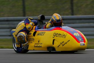 Waghalsige Akrobatik auf dem Motorrad in der Seitenwagenzeit von Bernhard Wagner (l.) im Jahr 2005.