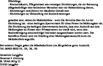 Melderegister nur erteilt wird, wenn eine Beeinträchtigung schutzwürdiger Interessen ausgeschlossen werden kann. Die betroffene Person wird vor Erteilung einer Auskunft an Firmen und Privatpersonen durch die Meldebehörde angehört.