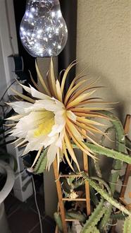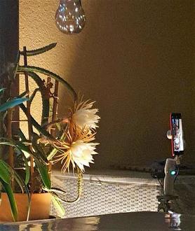 Wer diese Kaktusart in unseren Breiten als Zierpflanze hält, entdeckt in der Regel die Knospen zwischen April und Mai, die Blüten dann im Juni bis August. Sie öffnen sich besonders gerne in warmen Regen- oder Gewitternächten. Die Blüten riechen gut und werden bis zu 30 cm lang bei gleich großem Durchmesser. Die äußeren Blütenblätter sind schmal und gelb-bräunlich, die inneren breiter und weiß. Sie öffnen sich in einer durchgängigen langsamen Bewegung, die etwa ein bis zwei Stunden dauert. Stephanie Johnson hat auch Zeitraffervideos vom Entfalten der Blüten gemacht. „Ich denke, die letzten zwei Blüten werden sich auch noch zusammen öffnen, mal abwarten“, hofft die Kaktusfreundin. Es bleibt also spannend.