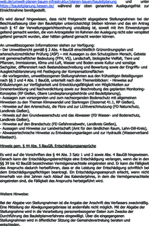 Es wird darauf hingewiesen, dass nicht fristgerecht abgegebene Stellungnahmen bei der Beschlussfassung über den Bauleitplan unberücksichtigt bleiben können und das ein Antrag nach § 47 der Verwaltungsgerichtsordnung unzulässig ist, soweit mit ihm Einwendungen geltend gemacht werden, die vom Antragsteller im Rahmen der Auslegung nicht oder verspätet geltend gemacht wurden, aber hätten geltend gemacht werden können.