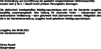 Die elektronisch bereitgestellten Beteiligungsunterlagen sind von der Gemeinde Langgöns sorgfältig zusammengestellt. Eine Haftung für eventuelle Fehler - insbesondere der elektronischen Verfälschung - kann gleichwohl nicht übernommen werden. Maßgeblich sind die in der Gemeindeverwaltung Langgöns bereit gehaltenen Beteiligungsunterlagen.