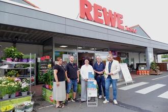 Sie haben gemeinsam die Ideenbox im Rewe-Markt Langgöns aufgestellt (v. l.): Marion Beppler vom Bereich Senioren und Soziales der Gemeinde Langgöns, Markus Krischke vom Rewe-Markt Langgöns, Projektbeauftragte Dr. Michaela Fink, Armin Elmshäuser, Vorsitzender des Sozial-, Sport- und Kulturausschusses der Gemeinde Langgöns und Bürgermeister Marius Reusch.