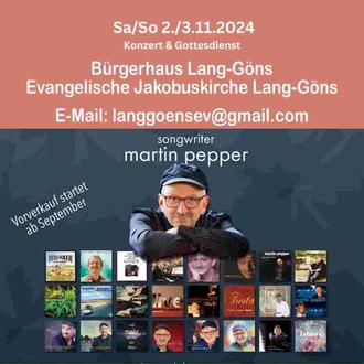 Der bekannte Songwriter MARTIN PEPPER kommt am 02.11. & 03.11.2024 nach Lang-Göns! In unseren Gottesdiensten singen wir sehr gerne seine Lieder. Am Samstag, den 02.11.2024 gibt Martin Pepper ein Konzert im Bürgerhaus Lang-Göns, Beginn ist um 19 Uhr. Der Kartenvorverkauf hierfür startet im September.