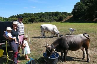 Weidenidylle mit Rätischem Grauvieh und der stolzen Besitzerfamilie Steffens