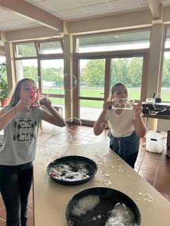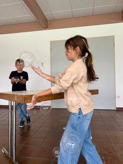 Wir versuchten auch, unsere eigenen Seifenblasen mit besonderen Mustern und Formen zu machen, was richtig gut klappte und für viel Gelächter sorgte. Zwischendurch gab es noch kleine Spiele und Rätsel rund um die Seifenblasen, bei denen wir viel Neues lernten. Am Ende des Tages waren alle begeistert von den magischen Experimenten und den bunten Blasen, die noch lange in unseren Köpfen schwebten. Es war ein wundervoller Tag voller Spaß, Staunen und magischer Momente!