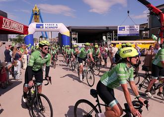Begeisterter Empfang bei Faber & Schnepp: Die Radler der Tour der Hoffnung rollen unter Applaus aufs Firmengelände