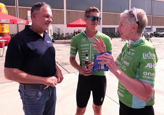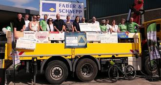 Langgöns (ikr). Bei strahlendem Sommerwetter wurden die rund 150 Teilnehmer der „Tour der Hoffnung“ in Langgöns auf dem Firmengelände von Faber & Schnepp von fähnchenschwenkenden Zuschauern begeistert empfangen. Insgesamt 22 Spenden aus Langgöns und Hüttenberg – überwiegend von Unternehmen, aber auch von der Gemeinde Langgöns, dem Gesangverein „Germania“ und der Hessischen Landesbahn GmbH – brachten die beachtliche Summe von 28.614 Euro zusammen.
