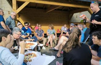 Der alte, imposante Kirschbaum spendet Schatten und zusammen mit dem insektenfreundlich angelegten Kräuter-, Blumen- und Heilpflanzenbeet verleiht er dem Garten eine besondere Atmosphäre. Der Duft der blühenden Pflanzen mischt sich mit dem Aroma frisch gebackener Pizza, die aus einem holzbefeuerten Ofen kommt. Denn seitdem freitags und samstags ab 17 Uhr gegenüber dem Garten wohnende Anwohner mit sizilianischen Wurzeln köstliche Pizza nach neapolitanischer Art servieren, hat der Begegnungsgarten einen zusätzlichen Reiz gewonnen. „Der Pizzagenuss, kombiniert mit einem Glas Wein oder einem erfrischenden Getränk, macht den Aufenthalt in diesem Garten zu einem wahren Vergnügen“, freut sich Doris Müller-Heinz, Vorstandsmitglied vom Heimat- und Geschichtsverein. Sie und ihre Mitstreiter um den Vereinsvorsitzenden Hans-Joachim „Jogi“ Röhrig haben den Begegnungsgarten federführend auf den Weg gebracht und kümmern sich gemeinsam mit der Dorfgemeinschaft um die Gestaltung und Pflege des Platzes. „So ein Ort hat im Dorf total gefehlt“, erinnert die Niederkleenerin und ist sehr froh, dass der Platz, ganz wie geplant, nun so gut angenommen wird.