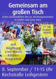 „Gemeinsam am großen Tisch“ lautet das Motto des ersten gemeinsamen Gemeindefestes im Nachbarschaftsraum Linden/Lang-Göns, welches am Sonntag, dem 8. September ab 11 Uhr begangen wird. Das Motto dürfen wir wörtlich nehmen! Falls es das Wetter zulässt, wollen wir einen großen Tisch in der Kirchstraße in Leihgestern aufbauen. Wir starten um 11 Uhr mit einem Gottesdienst in der Leihgesterner Kirche, bei dem auch der Posaunenchor aus Lang-Göns mitwirkt. Andere musikalische Aktivitäten sind geplant. Hier wird auch die neue Gemeindepädagogin für Leihgestern und Lang-Göns, Rebecca Mischke, in ihr Amt eingeführt.