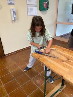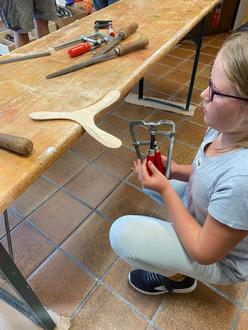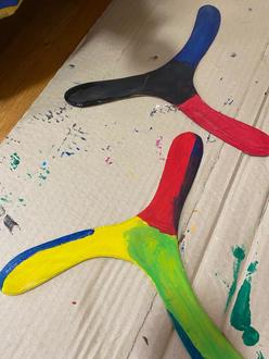 Die Kinder durften die Bumerangs zunächst aussägen, was viel Freude und Geschick erforderte. Danach ging es ans Bearbeiten: Schleifen, glätten und alles schön vorbereiten, damit die Bumerangs perfekt fliegen. Anschließend wurde bunt angemalt – hier konnten die kleinen Künstler ihrer Fantasie freien Lauf lassen!