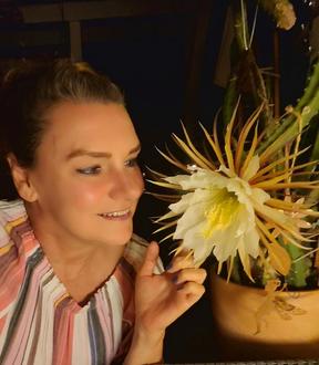 Stephanie Winni Johnson genießt den angenehmen Duft der seltenen Kaktusblüte.