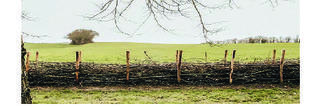 Für die Hecke werden zwei Reihen Holzpfosten im Abstand von 1-2 Metern in die Erde eingelassen. Zwischen den Holzpfählen werden unterschiedliche Äste und Zweige aufgeschichtet.