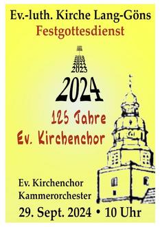 Wir laden herzlich ein zu einem Festgottesdienst am 29. September 2024 um 10 Uhr in die Jakobuskirche Lang-Göns. Anlass ist das 125-jährige Bestehen des Kirchenchores. Kirchenchor und Kammerorchester werden den Gottesdienst musikalisch gestalten -unter anderem werden Auszüge des 100sten Psalms aus Händels JUBILATE gespielt und gesungen. Musikalische Leitung: Hans-Joachim Reh.