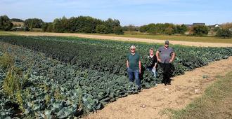 Karl-Heinz, Erika (mit einem Büschel Flowers Sprouts) und Michael Höringer auf ihrem gut sortierten Gemüsefeld vor den Toren Niederkleens.