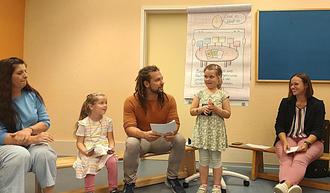 Beim Elternabend stellten die Kinderparlament-Sprecherinnen Isabell Dreikausen (stehend) und Emilia Fleck gemeinsam mit den Fachkräften Steffi Fleck (l.) und Jake Robin Höchst ihre Arbeit vor, r. Bernadette Mattern.