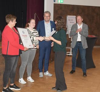 Übergabe der Urkunde in Bad Camberg an Bürgermeister Reusch, Luisa Pfuhl und Marion Beppler (v.r.)