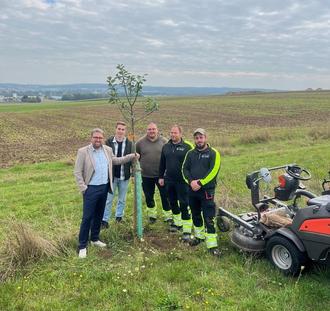 Die Mitarbeiter des Bauhofs besorgten den Baum und bereiteten gemeinsam mit Lukas Friedrich vom Umweltamt der Gemeinde, die Pflanzung vor. Bürgermeister Marius Reusch ließ es sich nicht nehmen, selbst Hand anzulegen: Mit dem Rasentraktor brachte er den Baum zu seinem neuen Standort - einer gemeindeeigenen Ausgleichsfläche zwischen Lang-Göns und Dornholzhausen am Mandlerweg. Dort wurde der Baum gemeinsam eingepflanzt, wo er hoffentlich bald gesunde Früchte tragen wird.