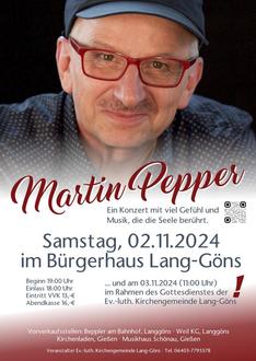Wir laden ganz herzlich ein zu einem Konzert mit dem bekannten Songwriter MARTIN PEPPER am 02.11.2024 um 19 Uhr im Bürgerhaus Lang-Göns. Eintrittskarten zu 13 € VVK können erworben werden bei