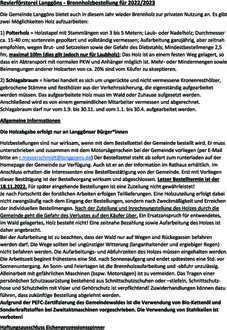 Holzbestellungen sind nur wirksam, wenn mit dem Bestellzettel der Gemeinde bestellt wird. Er muss unterschrieben und zusammen mit dem Motorsägenschein bei der Gemeinde vorliegen (per E-Mail bitte an c.messerschmidt@langgoens.de) Der Bestellzettel steht ab sofort zum runterladen auf der Homepage der Gemeinde zur Verfügung. Auch ist er an der Information im Rathaus erhältlich. Im Anschluss erhalten die Interessenten eine Bestellbestätigung von der Gemeinde. Erst mit Vorliegen dieser Bestätigung ist der Bestellvorgang wirksam und abgeschlossen. Letzer Bestelltermin ist der 18.11.2022. Für später eingehende Bestellungen ist eine Zuteilung nicht gewährleistet!