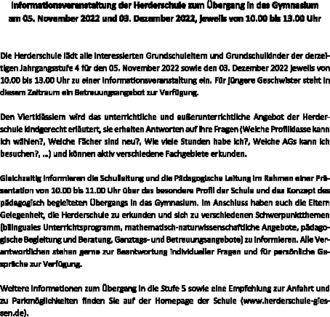 Die Herderschule lädt alle interessierten Grundschuleltern und Grundschulkinder der derzeitigen Jahrgangsstufe 4 für den 05. November 2022 sowie den 03. Dezember 2022 jeweils von 10.00 bis 13.00 Uhr zu einer Informationsveranstaltung ein. Für jüngere Geschwister steht in diesem Zeitraum ein Betreuungsangebot zur Verfügung.