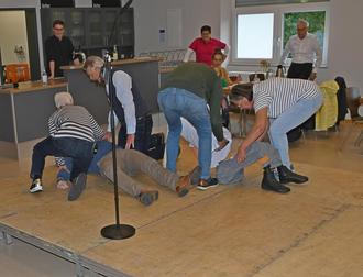 Langgöns (ikr). Großer Schreck beim Seniorennachmittag der Gemeinde Langgöns: Bürgermeister Marius Reusch fiel während einer Rede plötzlich um und musste reanimiert werden. Doch zum Glück war dieser medizinische Notfall nur ein Szenario, mit dem der Seniorenbeirat demonstrierte, wie Erste Hilfe richtig geleistet wird.