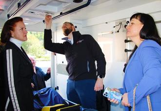 Thomas Hose vom DRK stellt den Rettungswagen der ukrainischen Delegation mit Tetiana Kuznetsova (l.) und Lesja Maltseva (r.) vor