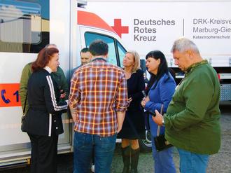 Zwischen dem 9. und 16. Oktober besucht eine Delegation aus Tschernihiw den Landkreis Gießen und nimmt die Spenden auf dem DRK-Gelände am Stolzenmorgen offiziell entgegen: (v. l.) Hryhorii Tkachenko (Mitglied des Gebietsrats von Tschernihiw), Niko Gerth (DRK), Serhii Harus (Vorsitzender des Gemeinderats von Ripkyne), Thomas Hose (DRK), Landrätin Anita Schneider, Christian Betz (Vorstandsvorsitzender DRK Kreisverband Marburg-Gießen), Alexander Mack (DRK Vorstand), Tetiana Kuznetsova (Leiterin des Bezirksrats von Tschernihiw), Udo Liebich (Büroleiter der Landrätin), Lesja Maltseva (Leiterin Angelegenheiten der Exekutive des Bezirksrats von Tschernihiw) und Marco Schulte-Lünzum (Regionalvorstand JUH Regionalverband Mittelhessen)