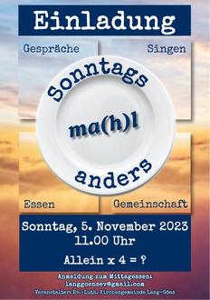 Am Sonntag, den 5. November feiern wir Sonntagsma(h)l anders um 11 Uhr in der Jakobuskirche. Anschließend laden wir zum gemeinsamen Mittagessen ein. Pfarrer Achim Keßler und Team werden diesen Gottesdienst zum Thema „Allein x 4 =?“ mit Ihnen feiern. Seien Sie gespannt, was sich hinter diesem Thema verbirgt, wir freuen uns, wenn Sie mit dabei sind.