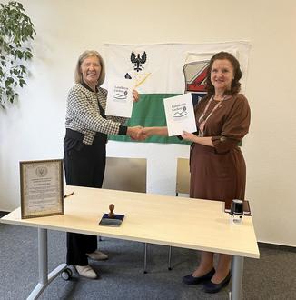 2) Auf gute Zusammenarbeit: Landrätin Anita Schneider (l.) und Tetiana Kuznetsova, Leiterin des Bezirksrates von Tschernihiw, unterzeichneten die Partnerschaftsvereinbarung