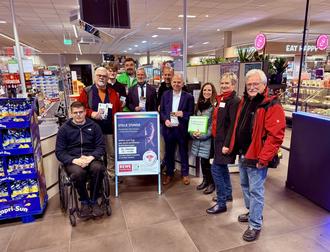 Legen gemeinsam die Stille Stunde auf mittwochs zwischen 14 und 17 Uhr im Busecker Rewe-Markt: (v. l.) Michael Volter, Geschäftsführer des Behindertenbeirats und Beauftragter für die Belange von Menschen mit Behinderung des Landkreises Gießen, Reiner Nitsch, Autismus Mittelhessen e.V., Jan Weigelt, Rewe-Markt Buseck, Jörg Luckert, Lebenshilfe Gießen, Frank Ide, Sozialdezernent des Landkreises Gießen, Nurhan Uras, Rewe-Markt Buseck, Frank-Walter Schmidt, Projektmanager Smart Region, Leticia Gobet, Gemeinwesenarbeit Buseck, Kornelia Steller-Nass, Gießener Arbeitskreis für Behinderte, und Norbert Weigelt, Gemeinde Buseck.