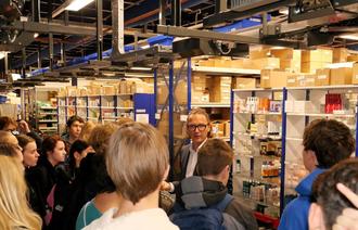 Sebastian Retzlaff mit Schülern der Weidigschule beim Rundgang durch die Räumlichkeiten der Apothekergenossenschaft Noweda