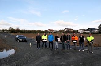 Zeitgleich mit der Vorstellung des ersten erschlossenen Bauabschnitts im Neubaugebiet Blankweg gab Bürgermeister Marius Reusch (Mitte) im Beisein von Vertretern der Gemeinde und der beteiligten Firmen auch den Startschuss zur Vermarktung der Grundstücke.
