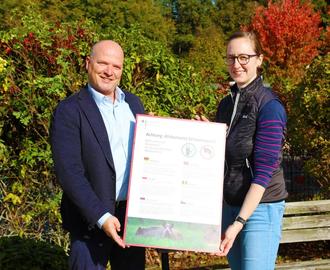 1) Hauptamtlicher Kreisbeigeordneter Christian Zuckermann und Amtstierärztin Dr. Lara Stein zeigen eines der Plakate, die in mehreren Sprachen über die richtige Entsorgung von Speiseresten zum Schutz vor der ASP informieren.