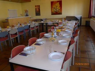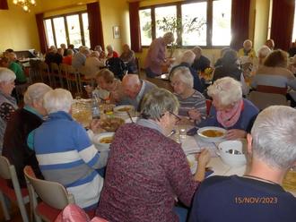 Sein Vorschlag, Suppe, Tafelspitz mit Meerrettich, Kartoffeln und Birnen zu servieren, fand sofort Anklang bei den Mitarbeitern. Sogleich waren auch die notwendigen Helfer für alle Arbeiten zur Vorbereitung gefunden. Überrascht waren die Verantwortlichen über die stetig wachsende Anzahl an Gäste, denn am Ende standen mehr als siebzig Namen auf der Liste. Im schön eingedeckten Gemeindehaus füllten sich die Tische zur Essenszeit. Die Verantwortliche Bettina Hilker begrüßte die Gäste und wünschet einen guten Appetit. Mit großer Freude verspeisten die Gäste das köstliche Fleisch und den nicht minder köstlichen Meerrettich, der in der Nase kitzelte. Als Überraschung boten ehemaligen Sängerinnen des Frauenchores Reste von Schnäpsen an, die gerne „vertilgt“ wurden.