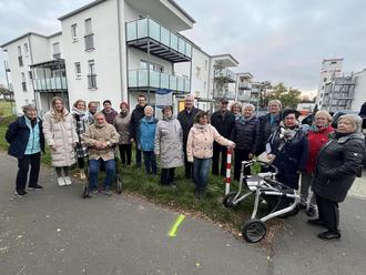 Zur Eröffnung des neuen Bewegungspfades sind neben Kreissportdezernent Christopher Lipp (hintere Reihe, 7. v. l.), Bürgermeister Rainer Wengorsch (hintere Reihe, 10. v. l.) und Petra Sattler (4. v. r.), erste Vorsitzende des TSV 1848 Hungen e.V., auch Bewohnerinnen und Bewohner des benachbarten Seniorenzentrums gekommen