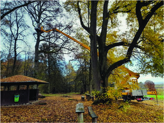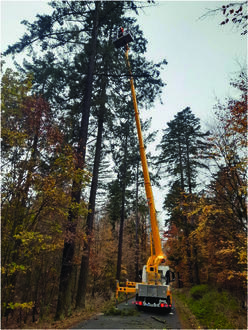 Am Zimmerplatz waren die stattlichen Linden betroffen, die die Schutzhütte einrahmen. Da das Fällen der landschaftsprägenden Bäume nicht in Frage kam, wurde durch den Bauhof ein mobiler Hubsteiger angemietet. Mit ihm konnten alle trockenen und verpilzten Äste aus den Baumkronen erreicht und entfernt werden. Der Mandler Weg war beidseitig im Wald betroffen. Hier waren vor allem kranke Eichen und trockene Äste von großen Douglasien die Gefahrenstellen. Die Verbindung zwischen Langgöns und Dornholzhausen wurde für einen Tag voll gesperrt, damit mit dem großem Gerät überhaupt gearbeitet werden konnte. Alle Arbeiten konnten fristgerecht und unfallfrei abgeschlossen werden.