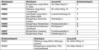 Am Sonntag, 1. Dezember 2024, findet die Direktwahl des Bürgermeisters der Gemeinde Langgöns statt. Die in der Tabelle befindlichen Wahlbezirke sind – wie üblich – zwischen 8:00 und 18:00 Uhr geöffnet.