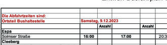 Auch in diesem Jahr haben sich ehrenamtliche Fahrer bereit erklärt an den beiden Markttagen mehrere Fahrten durchzuführen. Interessierte müssen sich jedoch vorab telefonisch bei der Zentrale der Gemeinde Langgöns Tel. 06403/ 90200 bis Freitag, den 8.12.2023 um 12:00 Uhr anmelden, damit die Fahrer entsprechend eingeteilt werden können. Ohne vorherige Anmeldung besteht daher kein Anspruch auf die Mitfahrt im Bürgerbus. Sollten tatsächlich freie, also nicht vorbestellte Plätze im Bürgerbus vorhanden sein, kann der Fahrer über die Mitnahme entscheiden. Der Bürgerbus hat jedoch nur eine Zulassung für insgesamt 7 Fahrgäste. Die Einstiegsmöglichkeiten sind an den, im nachstehenden Fahrplan, abgedruckten Haltestellen. Diesem können Sie auch die entsprechenden Abfahrzeiten entnehmen. Der Ein- und Ausstieg am Marktgelände ist die Breitgasse 3-7 (Stofflädchen).
