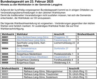 | Briefwahlbezirk | Wahllokal | Anschrift |